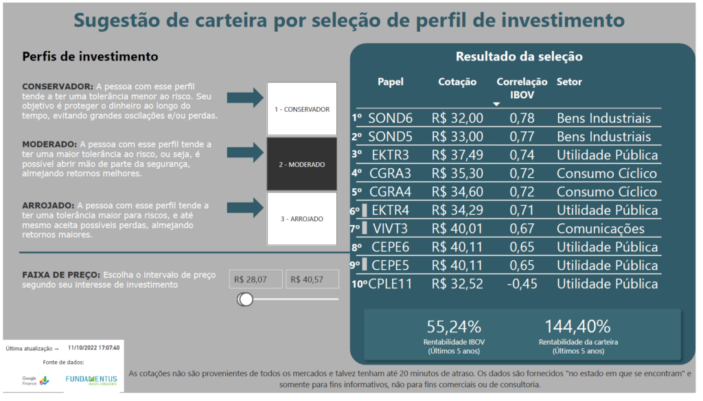 • Rentabilidade histórica da carteira e do IBOV nos últimos 5 anos.