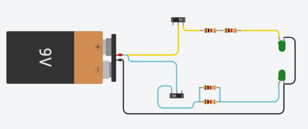 A eletrônica educacional se tornou mais acessível com ferramentas como o TinkerCad, um simulador online que permite projetar e testar circuitos elétricos sem a necessidade de componentes físicos. Na imagem acima, vemos um circuito alimentado por uma bateria de 9V, que combina ligações em série e paralelo para acender LEDs de maneira controlada.