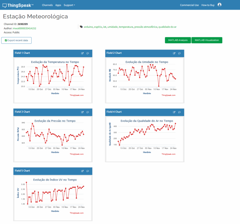 Esse processo permite que os dados sejam armazenados e visualizados em tempo real no canal do projeto no ThingSpeak: