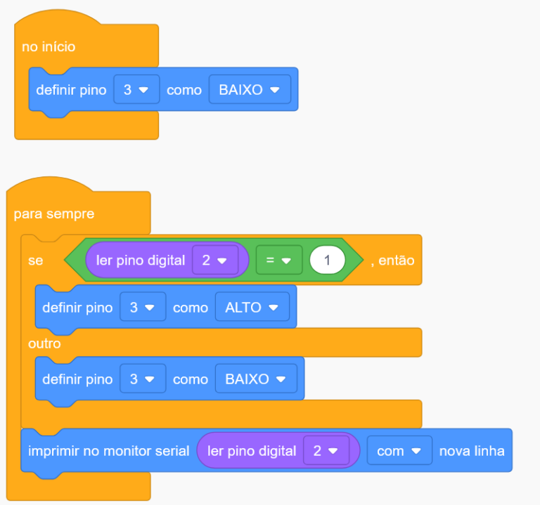 O bloco ler pino digital 2 lê o estado do sensor PIR, que está conectado ao pino 2 do Arduino.
